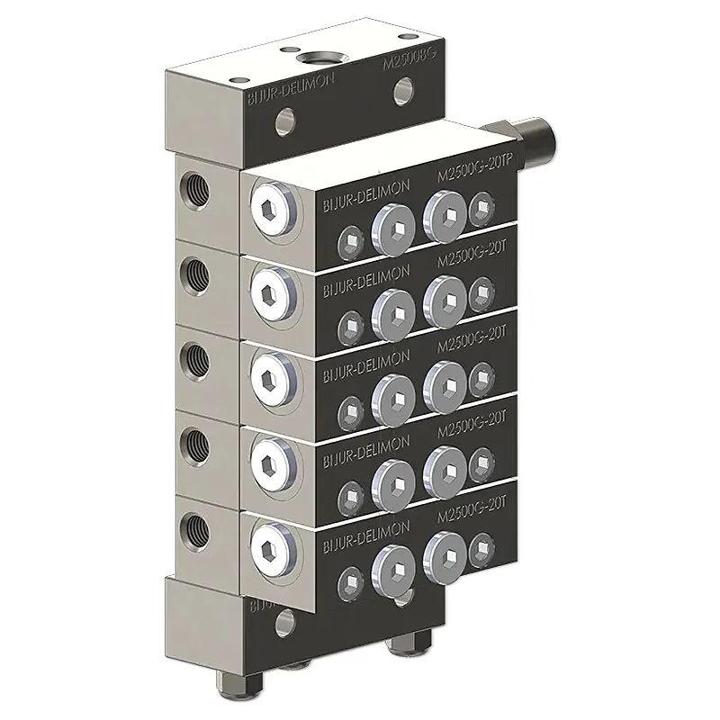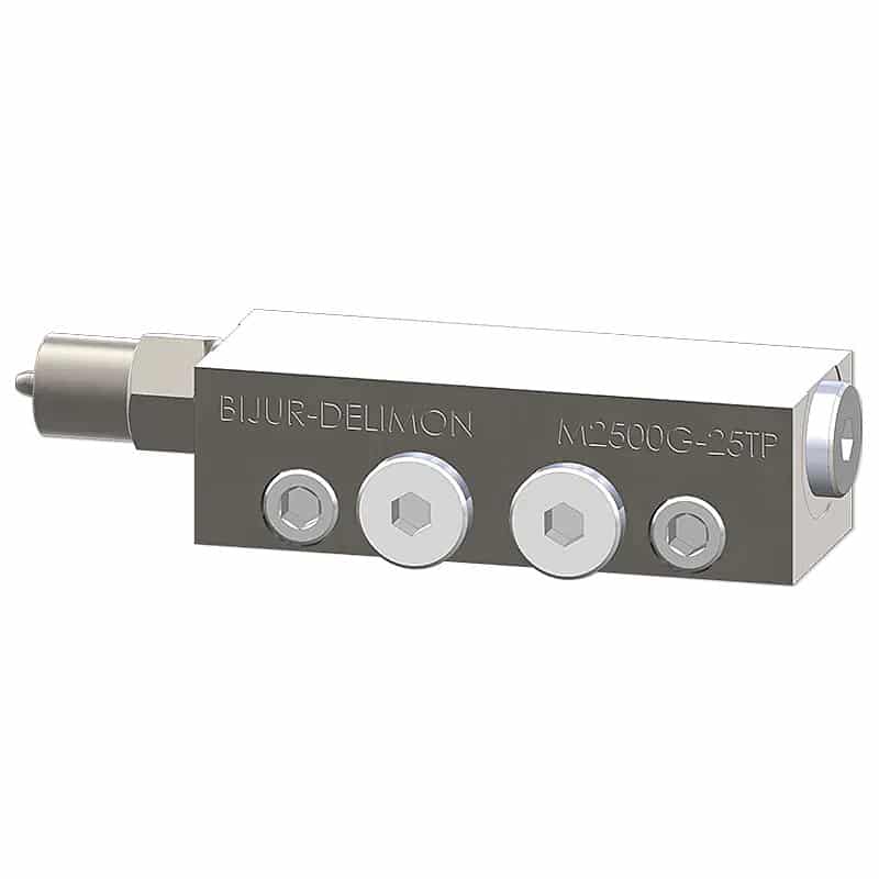 M2500G Divider Valves are easy to install, modify, and maintain. Progressive movement lubricant divider blocks operate in a pre-arranged sequence for easy system operation monitoring through a moving indicator pin. Normally, the pin transmits a signal to the system controller through an electrical limit switch at the end of a complete lubrication cycle.